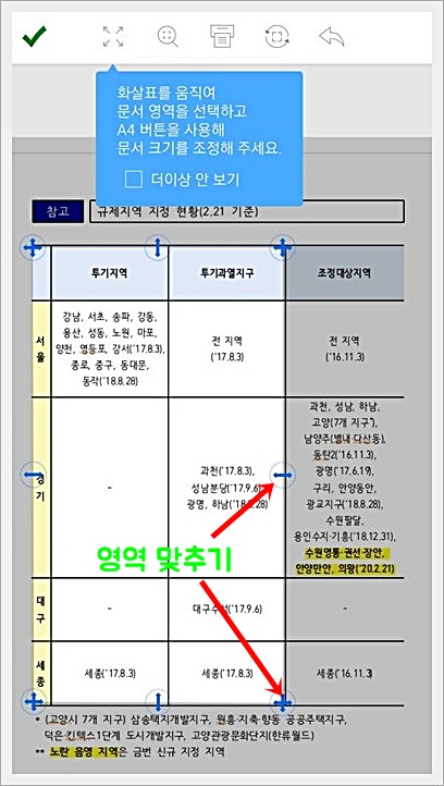 그랬더니 다음과 같은 영역을 맞추라고 나오는데요. 여기서 화살표를 끌어당겨 사이즈를 맞춰주면 됩니다.
