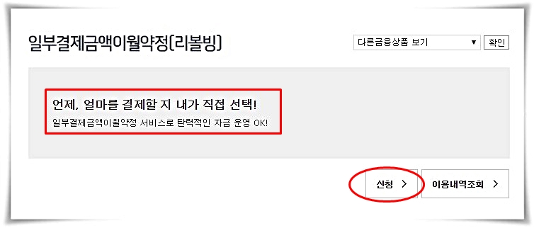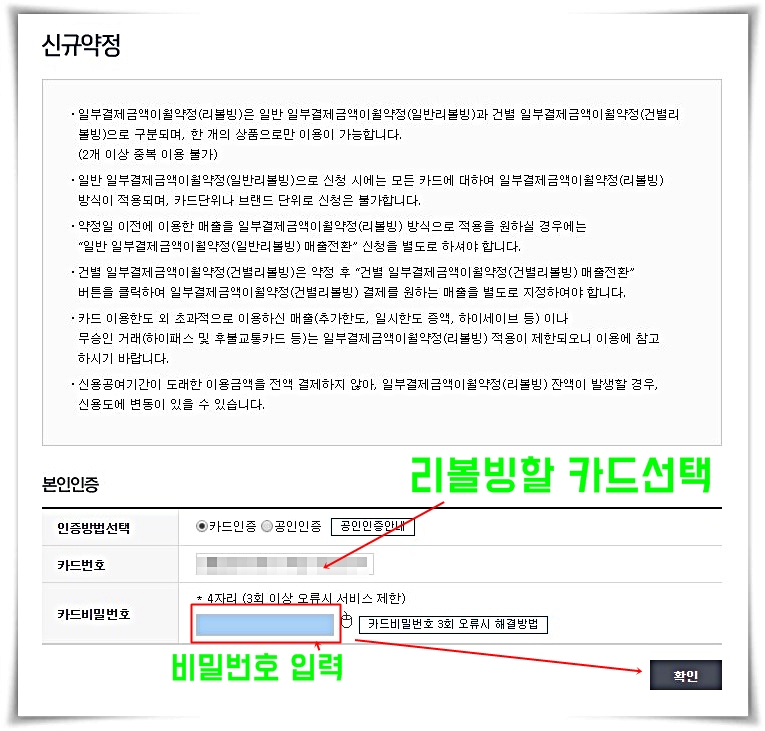 홈페이지에서 신청할 경우 리볼빙을 진행할 카드를 선택하고 자신의 비밀번호를 누른 후 해당 절차에 따라 진행하시면 신청이 완료됩니다.